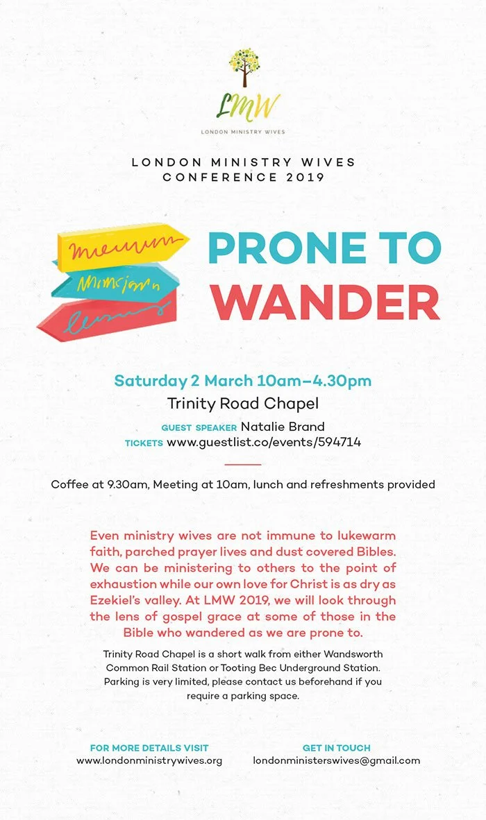 Even ministry wives are not immune to lukewarm faith, parched prayer lives and dust covered Bibles. We can be ministering to others to the point of exhaustion while our own love for Christ is as dry as Ezekiel’s valley. At LMW 2019, we will look through the lens of gospel grace at some of those in the Bible who wandered as we are prone to. As we learn from their struggles we will trace the beauty of Jesus and savour Him together.